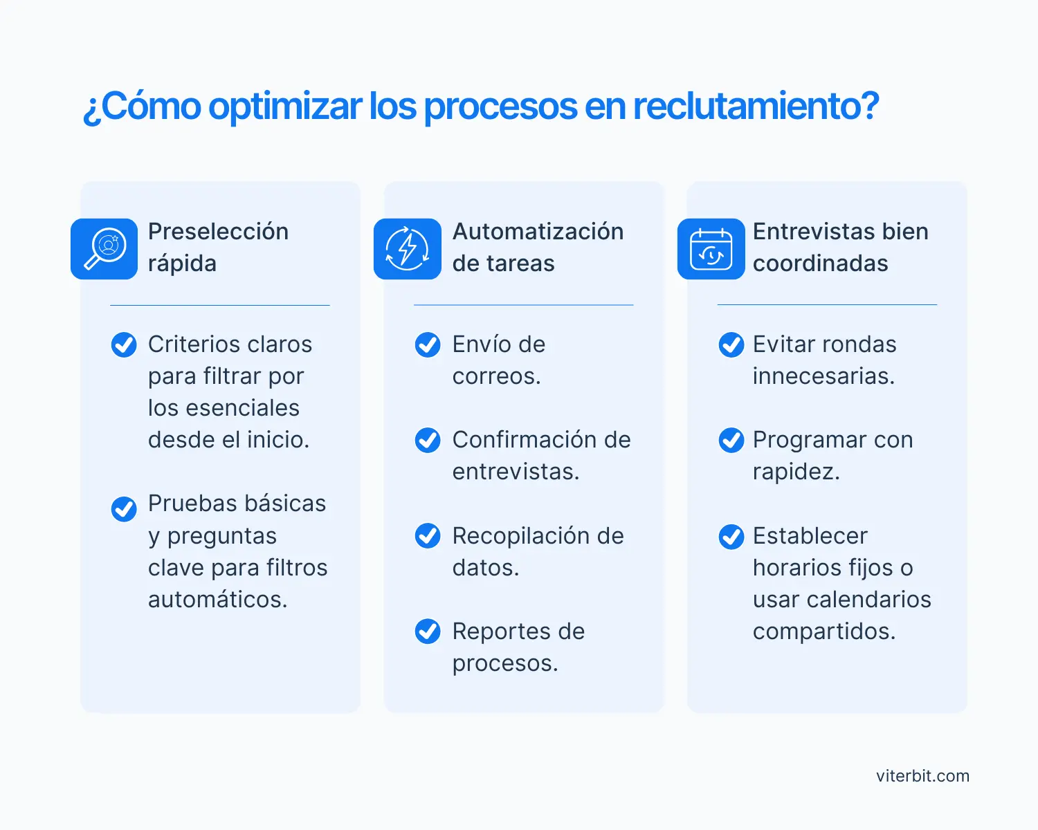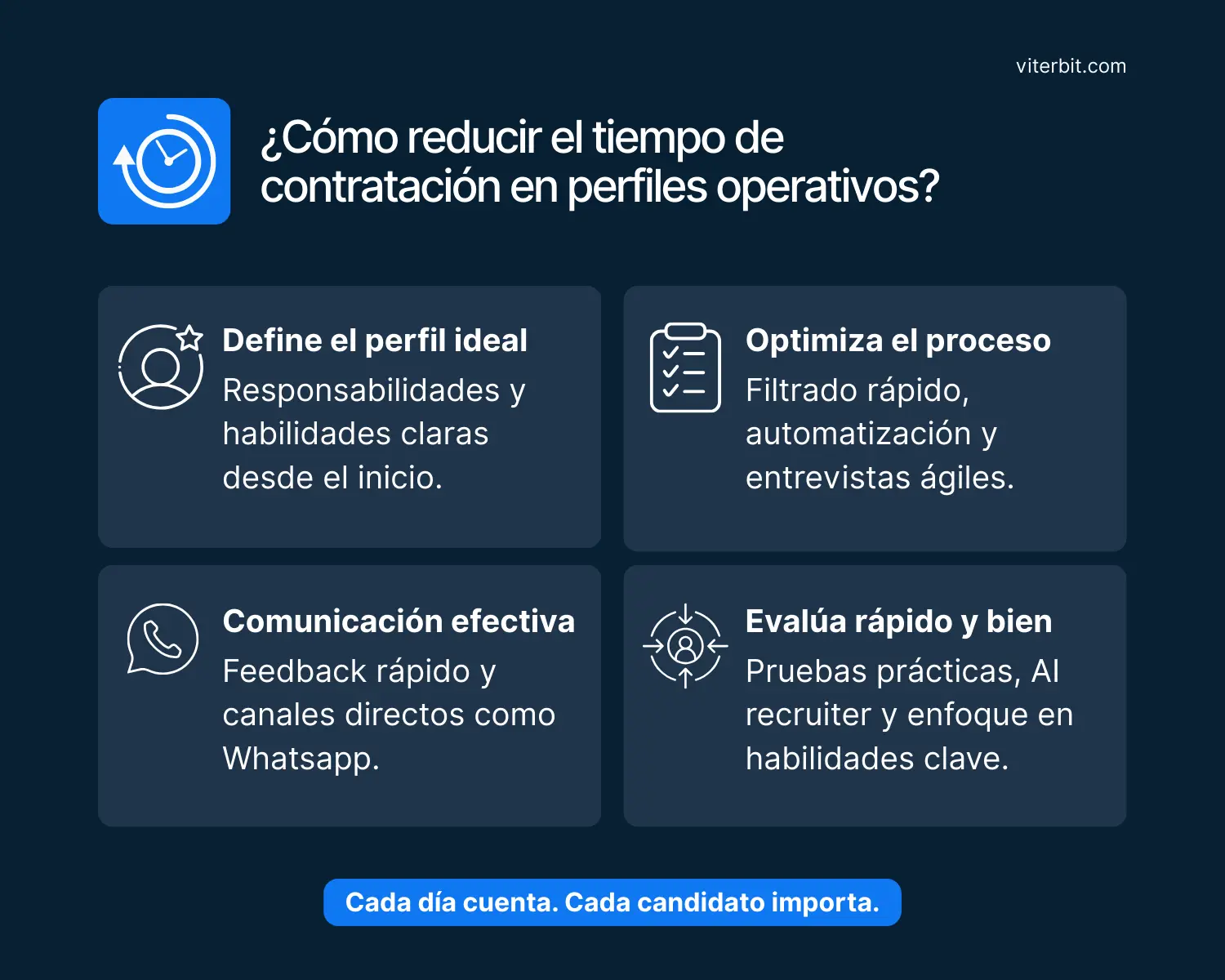 Una vez definido el perfil, toca optimizar el proceso completo para eliminar pasos que alargan innecesariamente la contratación. En perfiles operativos, cada día perdido se siente en la operación, así que ¡la agilidad es clave!
