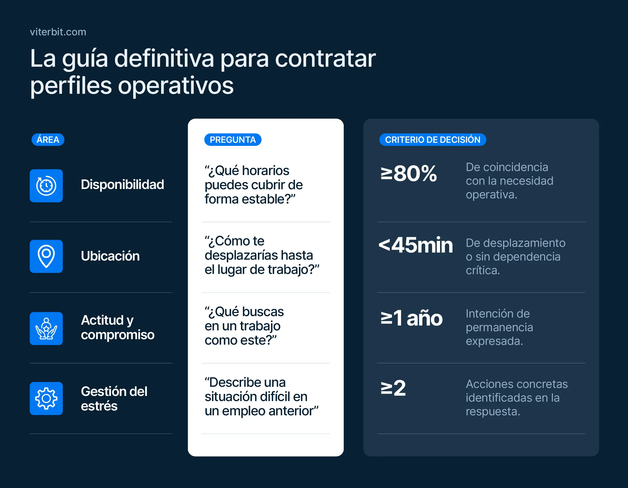 Muchas contrataciones fallan porque no se valida correctamente la disponibilidad horaria, la ubicación, el transporte o la motivación del candidato. Y esos errores, aunque parecen pequeños, terminan generando bajas prematuras, ausencias y rotación.