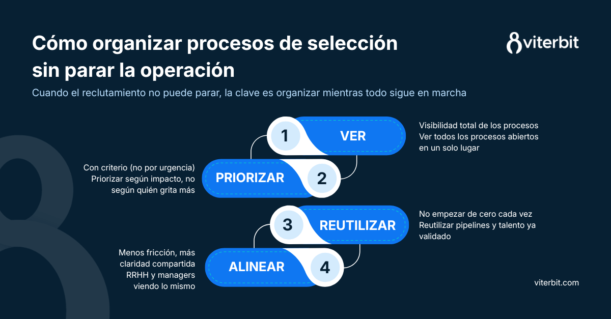 Esto no va de organización personal ni de “ser más productiva”. Es un problema estructural de volumen y continuidad. El reclutamiento deja de ser algo que empieza y acaba, y pasa a ser un flujo constante de procesos que se solapan entre sí. Y cuando eso ocurre, seguir trabajando igual que antes solo aumenta la sensación de urgencia y desgaste.